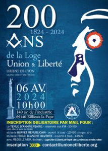 Les Frères d’Union et Liberté ont la joie et l’honneur de vous convier à la Tenue d’anniversaire des 200 ans de leur Loge : SAMEDI 06 AVRIL 2024 à 10 H00.