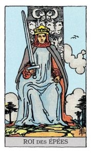 Le Roi des épées est le souverain de l’élément AIR que représente la suite des épées dans le tarot, parallèle à nouveau avec le Grand Expert, maître des énergies de la Loge dans le Temple. Nous y reviendrons aussi.